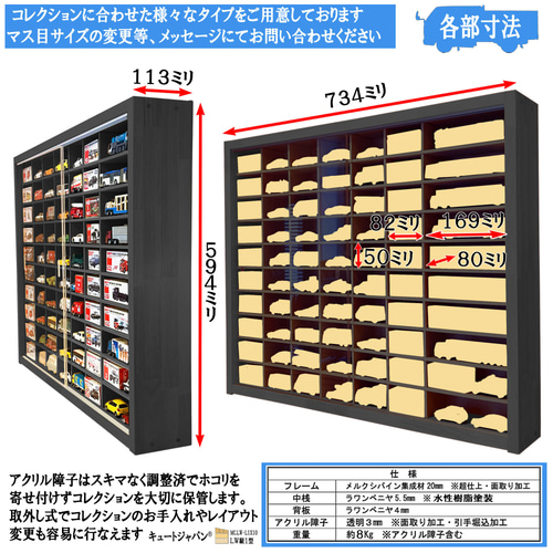 | 商品の特徴 | 木製ミニカーケース トミカ128台・大型サイズ対応 アクリル障子付。トミカ収納ケース アクリル障子付 160台収納 日本製 ミニカーケース。180台 トミカ収納 アクリル障子付 日本製 トミカケース ミニカー。アクリル障子付、収納ケース 未使用製作品 LW8×8W型です。ミニカーが1マスに2台収納、最大128台収納可能、大型サイズも収納できます。ダンボール箱などに眠ったままのミニカーを惹きたてるディスプレイケースです。外枠にメルクシパイン集成材・中桟にたわみの無い5.5ミリ厚のラワンベニヤ(中桟正面は塗装仕上)を使用しています。天然素材の木の香り、ぬくもりを感じられます。アクリル障子は透明度が高く、大切なコレクションをホコリや傷から守ります。大事に保管したい皆さまにご満足いただける一品と自負しております。コレクター様に『こんなの欲しかった!』 そう言わせたい一心で製作しました。アクリル障子付ケースは3割を超える方がリピート(感謝!)されています。ありがとうございます。お片付けが苦手なお子様にも楽しみながら整理上手に・・。プレゼントにもおすすめです。ミニカーは付属していません、ケース本体のみの販売です。購入時の注意点:材料は建材を使用していますが、表面は天然木のため色目・木目・節の具合がその都度変わります。天然単板独特の節目・木目の濃淡・接ぎ目が目立つ場合がありますが、構造上問題はありません。製作では裏面の意匠は視覚的に重要視していません。ご了承ください。●スライド式障子は光線透過率93%の高品質アクリル板3ミリ厚を使用しています。引手加工をほどこしていますので開け閉め楽々です。●外枠に木目を活かしたパイン集成材を使用しています。長年お使いいただけるよう頑丈な造りとなっています。※中桟は固定式で可動はしません。サイズをご確認のうえご購入ください。【本体サイズ】 巾734ミリ/高さ594ミリ/奥行113ミリ。【マス目寸法】 巾82ミリ/高さ50ミリ/奥行80ミリ。【大型サイズマス目】巾694ミリ/高さ105ミリ/奥行80ミリ。ご購入された方の『コレ、また欲しい!』の嬉しいご感想を励み(ビタミン剤です!)にして、日々製作を行っております。製作・販売元 株式会社キュートジャパン#キュートジャパン#トミカ#ホットウィール#京商#1/64#コレクションボックス#トミカケース#ミニカーケース#トミカ収納#ミニカー収納#プレゼント。ミニカーケース トミカ108台・大型サイズ対応 1/64 アクリル。MINI GT リバティーウォーク 日産 シルビア。昭和レトロな車。スナップオン ミニカー 5台セット。ミニカー Jada Toys DUB CITY。トミカ スタリオン。限定4000☆ホットウィール コンベンション ディナーカー プリムス バラクーダ。新品未開封 ホットウィール ブールバード 25カー ファクトリーセット。ダッジコロネット ミニカー。Hot Wheels モンスタートラック ゴールド。【未開封】 NASCAR '62 ポンティアック カタリナ 限定。トミカ フォードトラック 2台セット。廃盤 新品トミカリミテッドヴィンテージ エルフ ヤマザキ ファミマ 引越のサカイ。ミニカー REITO MOLA GT-R SUPER GT500 2013 1/18。【最終価格】トミカ 絶版品?05(5500→4999)。ランボルギーニ ディアブロ GTR 1/18。デアゴスティー二・コスモスポーツ。レーシングカート。【1Sホイール】黒箱トミカ/ホンダクーペ9/本田技研。絶版トミカ8台。ホットウィール 510 スーパートレジャーハント。フェラーリ Ferrari 641/2。★☆【絶版】☆★トミカリミテッド No.1~156 全コンプリート。ミニカー Crown athlete。トミカ 68 絶版 日野プロフィア 【送料別】値下不可。トミカ 67 絶版 日産ディーゼル ビッグサム 【送料別】値下不可。絶版トミカ6台 | ||